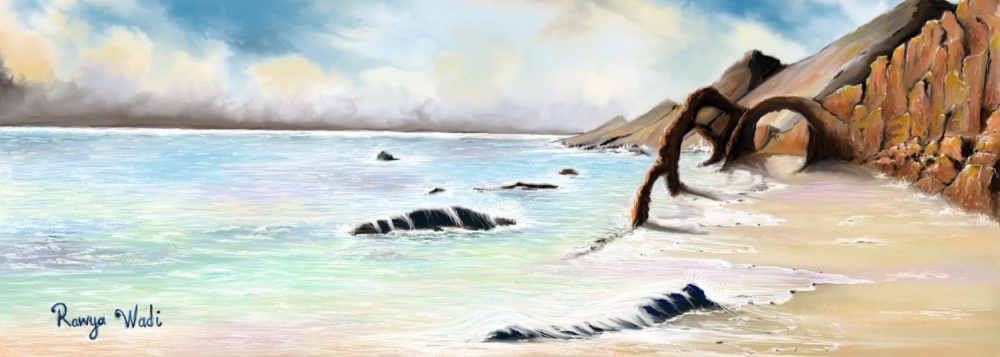 هبتْ تلكَ النسمةُ التي أجبرتهُ على التقاطِ أنفاسهِ .. ليدركَ كم هو غاضبٌ و ناقم. جلسَ ليسندَ ظهرهُ على حافةِ الجرفِ الذي يغمرُ جذعهُ الماءَ، و يضربهُ الموجُ من كلِ جانبٍ. أغلقَ عينيهِ، و فتح فمهُ واسعاً…. و ابتلعَ النسيمَ الباردِ بنكهةِ البحرِ. و أصغى لصوتِ الموسيقى العجيبةِ التي تصدرُ كلما ضربتْ موجةٌ الجرفَ …. و اخترقَ الريحُ تلكَ الفتحاتِ الصخريةِ المنحوتةِ … طبقةً طبقة .. كالأبوابِ، فشكلتْ بناءاً كأنه قلعةٌ منسيةٌ …  هجرها أهلها منذُ زمنٍ بعيد.